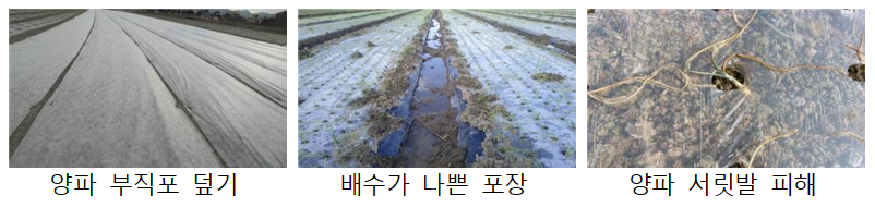 양파 심기 늦어진 포장은 정식이 늦어진 포장은 동해 예방을 위해 부직포 또는 유공비닐로 이중 피복하도록 하며, 무처리 대비 상품수량은 부직포 199%, 무공PE필름 179%, 유공PE필름 164% 논 양파 재배 시 11월 중순 이후 늦게 심은 경우 부직포 이중 피복 아주심기 후 10일 전후(11월 하순 또는 12월 상순), 고정핀 2~3m 간격 고정 양파 초기관리 전년도 양파 노균병 발생 우려 지역은 정식 후 7일 간격으로 2회 예방적 방제, 잎이 마르거나 생육이 부진한 포장은 제4종 복합비료 또는 요소 0.2%(물 20L에 40g)를 5~7일 간격으로 2~3회 살포하도록 합니다.